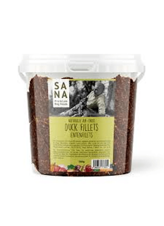Al het goede van boerderijvers eendenvlees, voorzichtig luchtgedroogd zonder de nare ingrediënten. De filets zijn graan- en glutenvrij, bevatten veel eiwitten en zijn licht verteerbaar. Maar het belangrijkste: ze zijn absoluut heerlijk! De Sana Dog filets zijn niet alleen geschikt voor alle rassen, maten en leeftijden, ze zijn ook perfect voor honden met allergieën of voedselovergevoeligheden omdat ze geen tarwe, maïs, soja, zuivelproducten of onnatuurlijke toevoegingen bevatten.